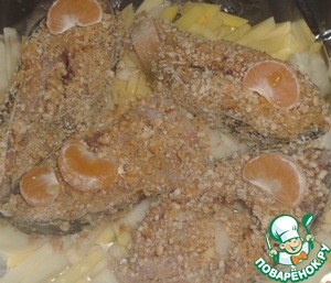 Карп запеченный на картофельной подушке в аппетитной панировке и с мандаринами.