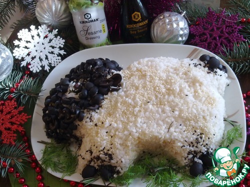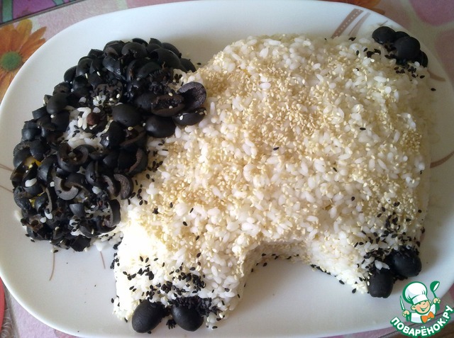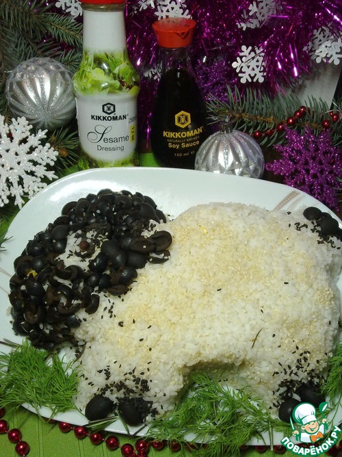 Сверху покрываем овечку шубкой - оставшейся частью отварного риса и начинаем формировать силуэт овечки, голову выкладываем измельченными маслинами. Из целых маслин делаем ножки. Ушки и хвостик делаем из половинок маслин. Салат в виде овечки сверху я посыпала белым и черным кунжутом. Подаем салат "Овечка" к праздничному столу.