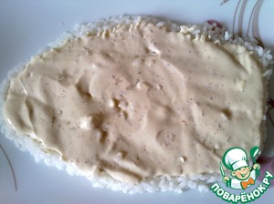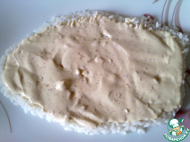 Вареный рис разделить на три части. На блюдо выложить одну часть риса в форме силуэта овцы и смазать его 2 ст. л. приготовленного соуса. (У меня сразу точные контуры овцы не получились, выложив все слои салата, я взяла столовую ложку и ей сформировала форму овцы.)