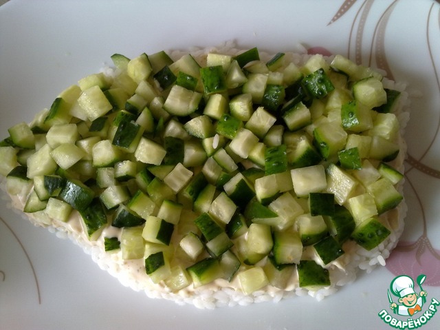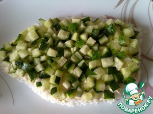 Вторым слоем выкладываем огурцы, смазываем соусом.