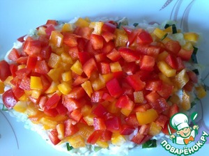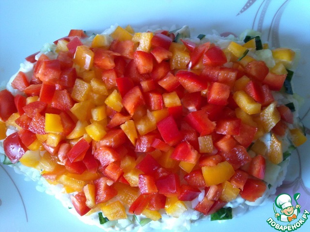 Следующий слой - рис, смазываем соусом. Четвертый слой болгарский перец, (я взяла перец двух цветов) и смазываем соусом. На перец выложить нарезанный кубиками сыр, смазать соусом.