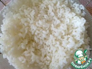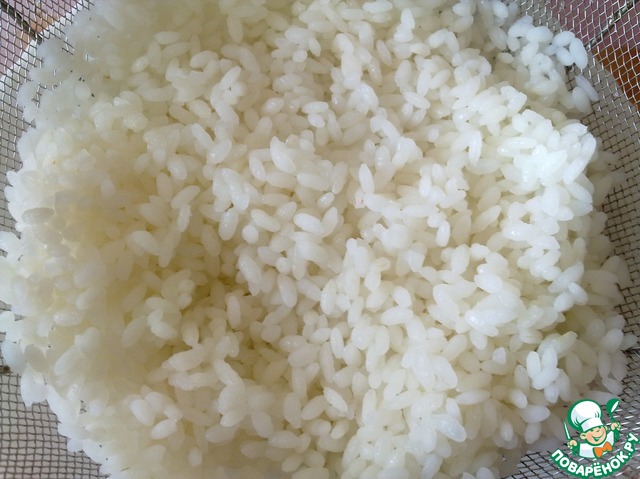 Варим рис в подсоленной воде до полной готовности. Откидываем на дуршлаг и промываем холодной водой. Оставляем на 10 минут, чтобы стекла вода.