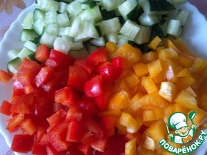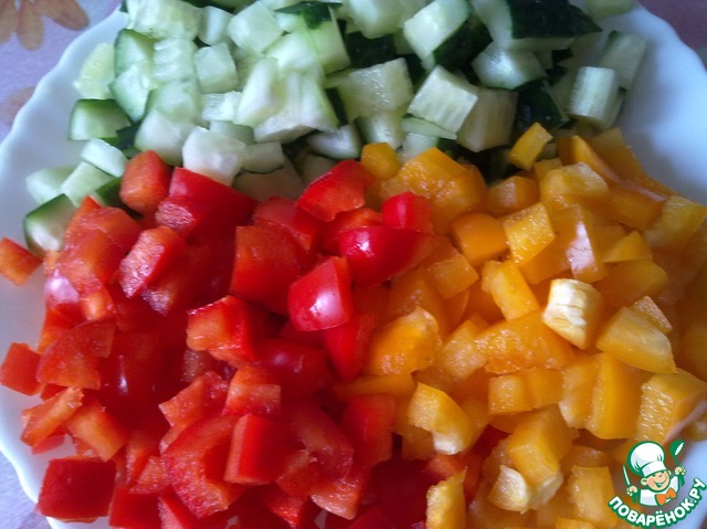Огурцы и болгарский перец режем кубиками.