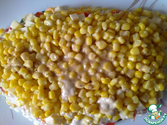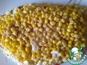 Теперь делаем слой из кукурузы и смазываем соусом.