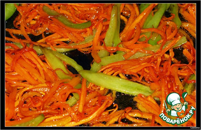 • В этой же сковороде обжарить морковь и перец, до золотистого цвета перца (около 10 минут).