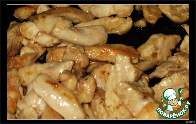 • Обжарить на растительном масле куриное филе. Переложить в другую посудину.