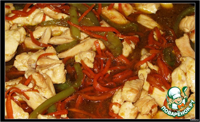 • Соевый соус перемешать с сахарным песком и влить в курино-овощную смесь.