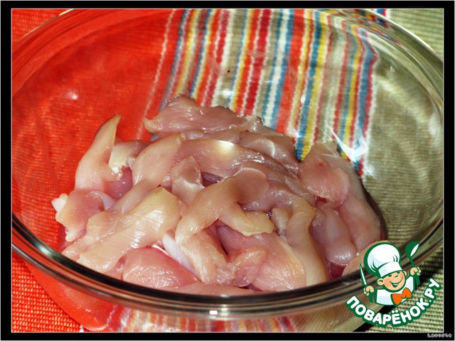 • Грудку освободить от хряща и нарезать длинными тонкими полосками.