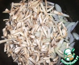 Лук и грибы порезать соломкой и обжарить на растительном масле почти до готовности.