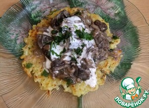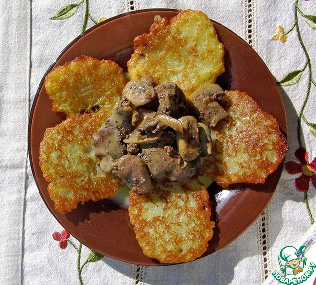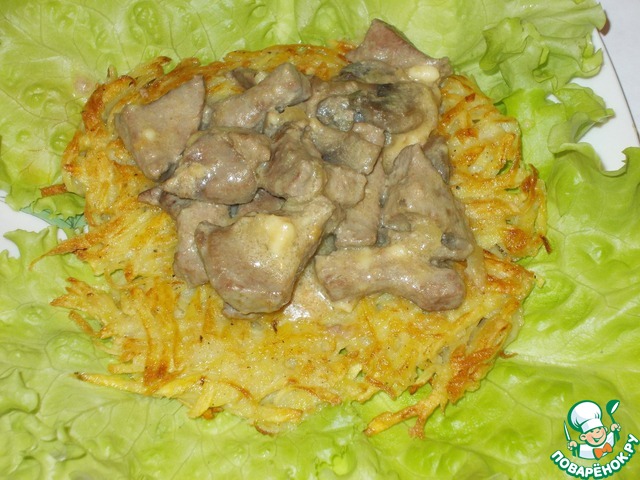 Рецепт «Печень с грибами на картофельной тарелке»: