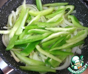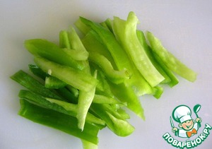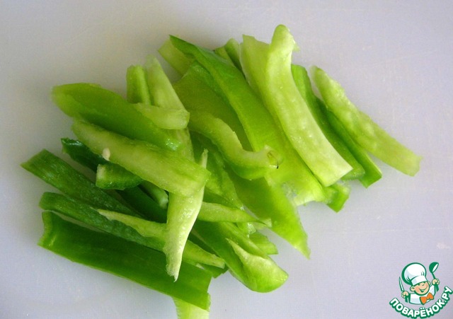 Перец очистить от семян и хвостиков и нарезать полосками.