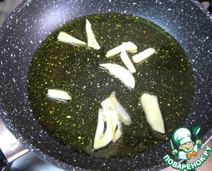 Чеснок нарезать ломтиками, разогреть масло, жарить чеснок