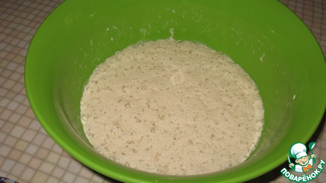 В готовую опару добавляем муку. Вымешиваем тесто, пока в нем не образуются пузырьки воздуха. Оставляем готовое тесто в теплом месте на 10 минут.