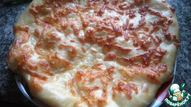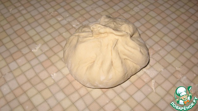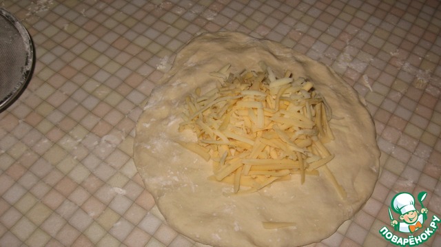 Из теста делаем круглую лепешку. Из сыра формируем шарик и выкладываем его в центр пласта.