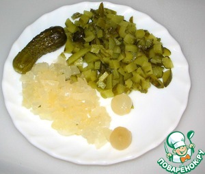 Корнишоны и луковички (6 шт.) мелко нарезать. По пару штук оставить для украшения.