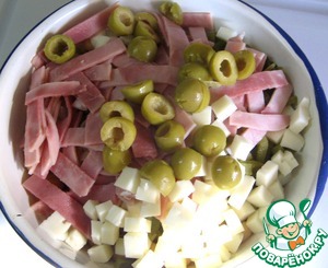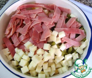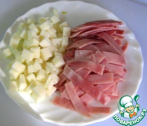 Ветчину нарезать тонкими и короткими полосками. Сыр нарезать брусочками.