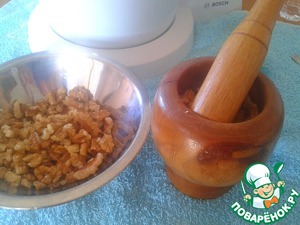 Грецкий орех слегка измельчить в ступке, затем отправить в общую смесь.