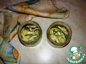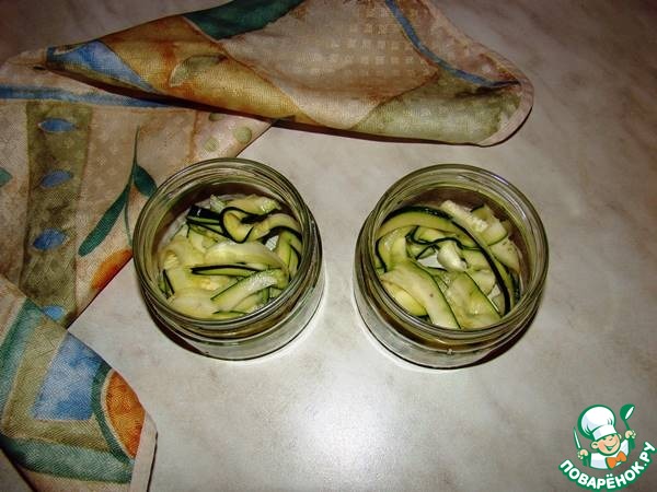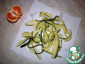 Цуккини режем тонкими лентами ножом для чистки овощей, раскладываем в большое сито и солим. Оставляем на 10 минут