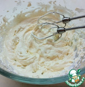 Для крема взбить творог со сгущёнкой и ванилином. Затем, не прекращая взбивать, ввести 200 мл сливок.