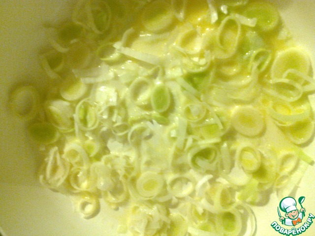 Половину сливочного масла растапливаем в сковороде и обжариваем в нем лук в течение 5 минут. Я больше люблю это блюдо делать с луком-пореем, но в оригинальном рецепте репчатый лук