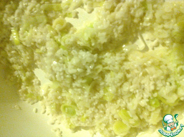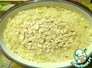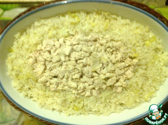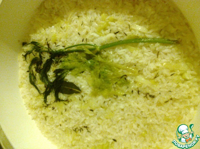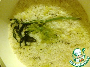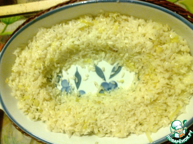 Вынимаем лаврушку с петрушкой - они свое дело сделали! Выкладываем рис кольцом в форму для запекания или же на смазанный маслом противень
