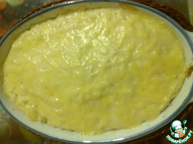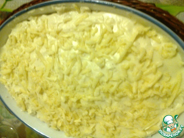 Посыпаем оставшимся сыром и ставим в предварительно нагретую (до 210 градусов) духовку на 10 минут или держим там, пока все слегка не подрумянится