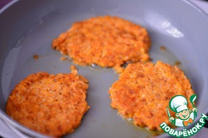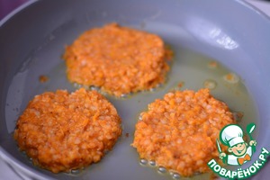 На раскаленную с маслом сковороду, столовой ложкой выкладываем наши котлетки. Обжариваем минут 5 с одной стороны.