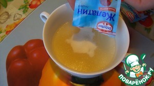 3. В 1/3 стакана мясного отвара высыпать 30г желатина и оставить на 40 минут.