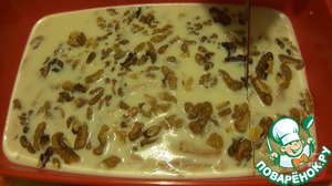 6. Полученной смесью залить мясо в форме. Выложить грецкие орехи. И поставить в холодильник на 2-3 часа до полного застывания.