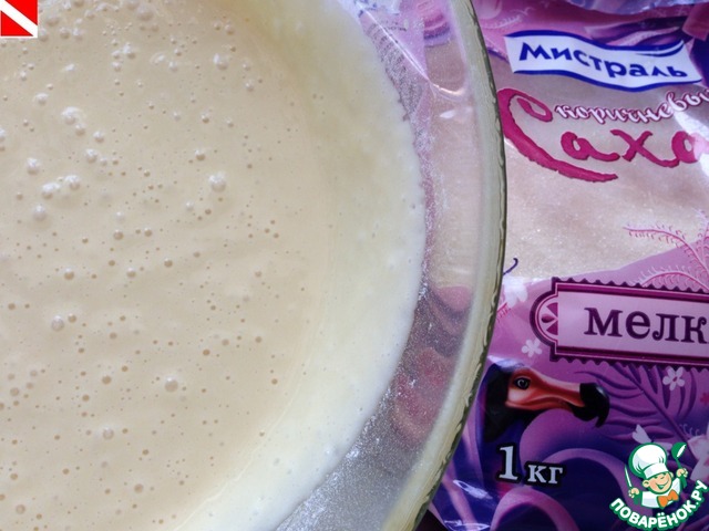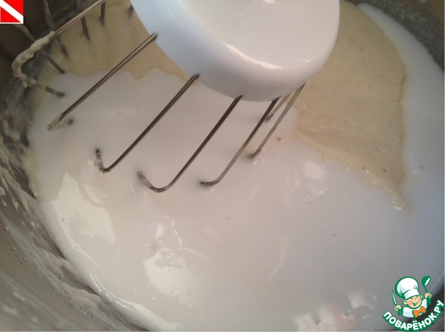 Готовим бисквитное тесто: взбиваем яйца, постепенно вливаем сгущенное молоко, добавляем соду, муку.