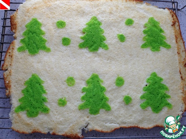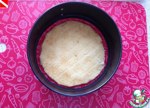 Кладем самый большой корж на дно формы, а вырезанные бортики (из теста с елочками) ставим в кольцо от разъемной формы елочками наружу. Бисквит очень нежный, лучше это делать вдвоем