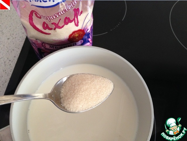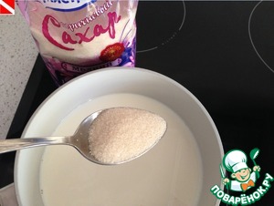 Готовим крем: в молоко всыпаем сахар, нагреваем