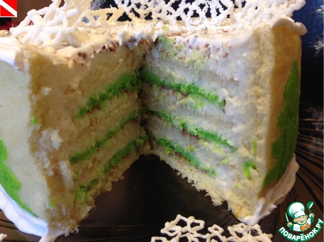 Собираем торт: все просто - белый корж - крем - натертый на мелкой терке шоколад - зеленый корж - крем и т. д. Украшаем снежинкам из айсинга и взбитыми сливками.