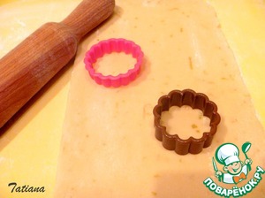 Раскатайте пласт толщиной 0,5 см., вырежьте формочками печенье (диаметр 3,5-4 см.) -