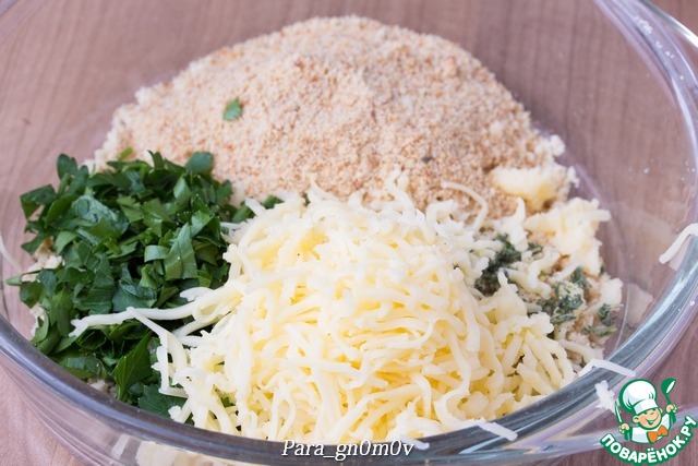 • 2. На сухой сковороде немного подсушить орехи. Измельчить как можно мельче. Зелень мелко порезать, сухари измельчить. Сыр натереть на мелкой терке.