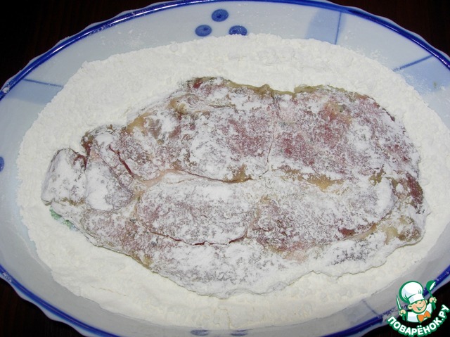 • Панируем отбивные в муке (это нужно для того, чтобы при запекании в духовке отбивные не потеряли сочность), стряхиваем ее излишки
