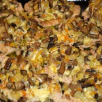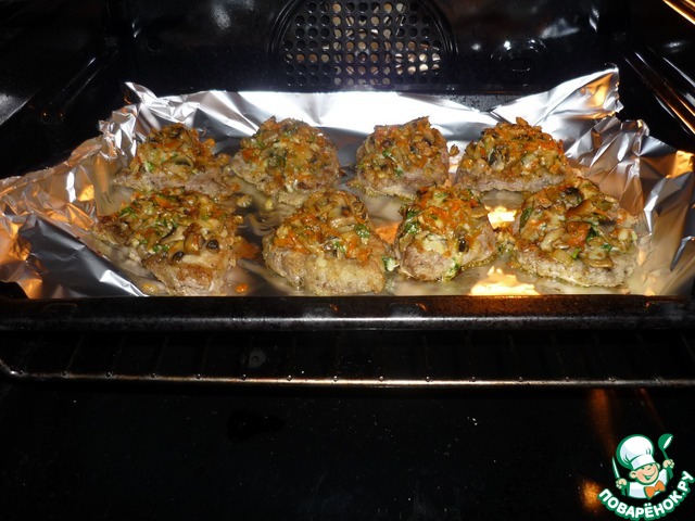 Делала на ДР, всем очень понравилось, а я ела и сама себя нахваливала. Правда мясо я не обжаривала, а сразу уложила на смазанный протвень и сверху начинку, и минут на 20 в духовку при температуре градусов 200. Мясо было сочное, а начинка мммммм. Ее и так есть можно, и без мяса