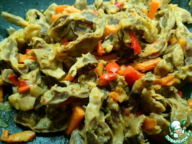 соевый соус. Тушить желудки минут 15 под закрытой крышкой.