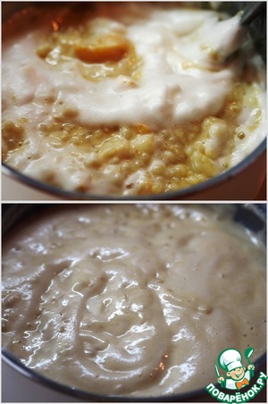 Слегка остудить крупяную смесь и добавить в кастрюлю тростниковый сахар, цедру, коньяк (по желанию, - но мой подарок готовился для взрослой девочки, поэтому у меня такое желание было!!)), растертые желтки и порезанные на мелкие кусочки консервированные персики (обязательно отложите для соуса половину персиков). Хорошенько всё размешать.