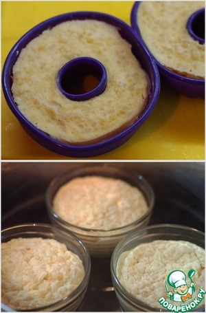 Выложить массу в формочки и поставить в пароварку на 1 час. Т. к. у меня нет пароварки, то я разложила всё сразу по стеклянным креманкам и силиконовым формочкам (смазав 1ст. л. сливочного масла) и поставила в кастрюлю с кипящей водой, доходящей до половины формочек, чтобы они варились на пару.