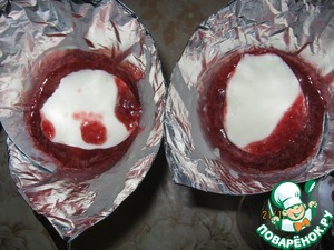 Достаем из холодильника и вставляем творожные вершинки в кулечки с клубничным пюре. Если клубничное пюре не достает до основания творожных вершинок здесь нам понадобятся остатки неиспользованного пюре. И отправляем наш десерт в холодильник на 1 час