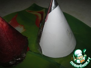 Когда наш десерт застыл, обрезаем края бумаги с фольгой, переворачиваем ставя на блюдо и аккуратно снимаем кулек. Если с творожной заготовки кулек просто слетал, то с клубничного пюре помогаем себе снимать кулек ножиком.