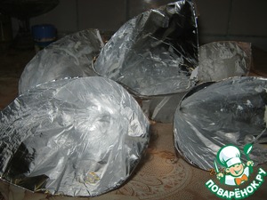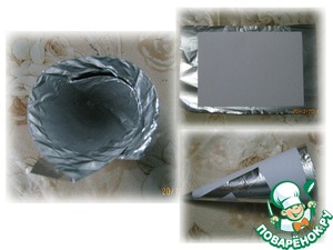 Первым шагом сделаем заготовки под наш десерт. Нам понадобится 6 листов бумаги формата А4, немного скотча и пищевая фольга. Лист бумаги складываем пополам и кладем на кусочек фольги чуть большего размера, края фольги загибаем на бумагу. Сворачиваем кулечек и закрепляем скотчем, но не намертво. Кулечки установить в стаканы или баночки, чтобы не перевернулись.