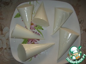 Творожная масса получается жидкой и в кулечки ее заливаем половником. Внимание, лучше лить на стенку где нет стыка, чтобы масса не затекала, куда не нужно. И отправляем нашу первую заготовку в холодильник на 1,5 часа. Затем аккуратно подрезаем скотч (лучше канцелярским ножом) и достаем творожные вершинки. Заготовки отправляем обратно в холодильник.