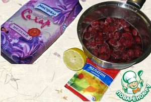 Клубнику размораживаем и немного потолчем толкушкой. Немного взбиваем клубнику с сахаром и добавляем желатин для набухания (10 минут). Затем подогреваем на огне, пока желатин не растворится.