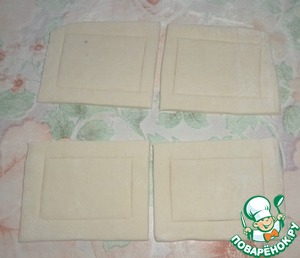 Из слоеного теста вырезаем прямоугольники. Делаем надрезы по середине прямоугольника, отступая от края. Это нужно для того, чтобы потом вырезать серединку и наполнить ее начинкой.