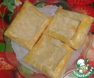 Прямоугольники смазываем желтком и ставим в духовку выпекать при температуре 180 градусов до готовности и румяного цвета. Готовым слойкам даем остыть.