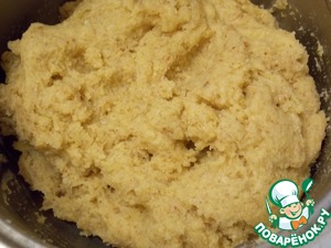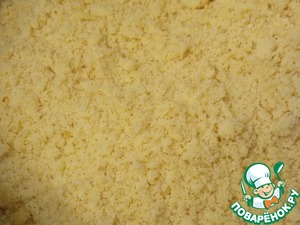 Смешать все виды муки, песок. Масло перетереть с мучной смесью.