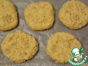 Если возьмем кусочек теста, величиной с грецкий орех, положить на противень, застеленный пекарской бумагой и немного прижать. Это получатся печеньки. Их мы выпекаем при t= 180 мин. примерно 20-25 мин. вынимаем и даем полностью остыть.