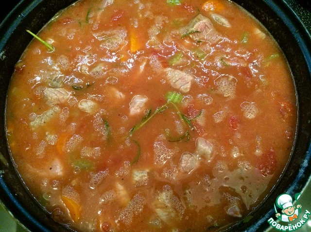 Вливаем эль, томаты в собственном соку, хорошо солит-перчим, добавляем паприку. Даем закипеть, накрываем крышкой и ставим в духовку, разогретую до 200 градусов Цельсия на 2.5-3 ЧАСА! Ориентируйтесь на свою духовку.